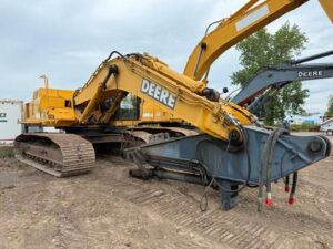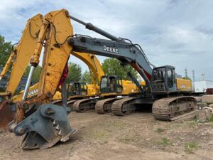 The upcoming auction features an array of equipment including John Deere Big Excavators, an extensive collection of demo attachments, wrecking balls, shears, grapples, thumbs, 2nd & 3rd members, poles, a substantial amount of support equipment, scrap, and a group of mini excavators.