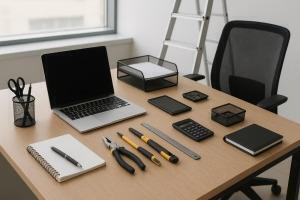 The auction includes a variety of office furniture and tools. Images of some of the lots are displayed below: