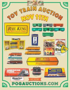 Pot Of Gold Auctions is hosting a Toy Train auction event with an opportunity for attendees to preview the items in person. The event is scheduled for Tuesday, November 11th, from 10:00 AM to 5:00 PM.